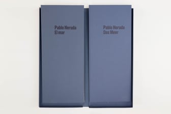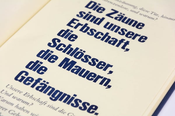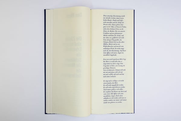 Textband mit drei deutschen Übersetzungen von Curt Meyer-Clason, Fritz Rudolf Fries und Fritz Vogelgsang, Typografie und Handsatz von Christa Schwarztrauber,