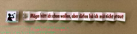 Karl Valentin: Mögen hätt ich schon wollen ..., Leporello-Streifen in Klarsichbox, 2,4 × 2,6 × 1,6 cm, je 7 Euro